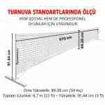 Dropick Pickleball Filesi, 6.70 m uzunluk ve 91.5 cm yükseklik ölçüleriyle IFP onaylı turnuva standartlarına sahiptir. 86–87 cm yüksekliğindeki orta destek direği, fileyi her zaman ideal gerginlikte tutar ve düz, dengeli bir oyun yüzeyi oluşturur.