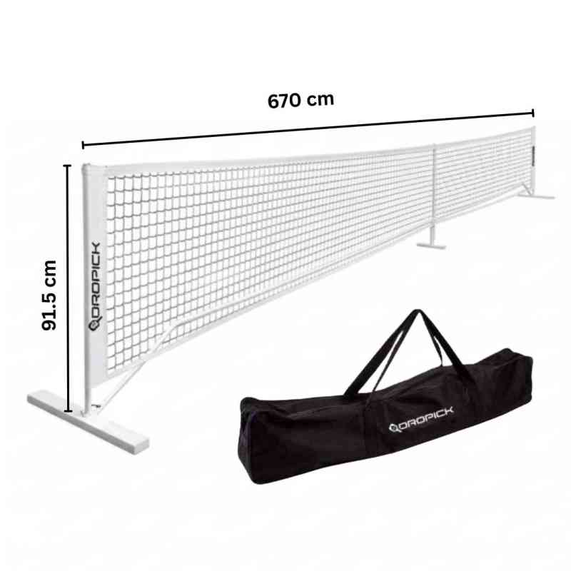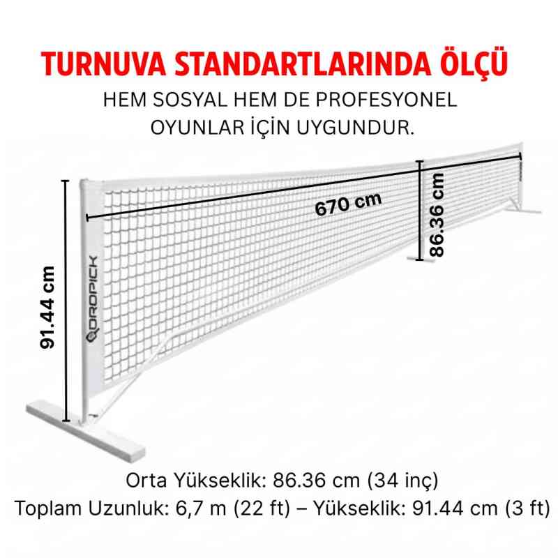 Dropick Portatif Pickleball Filesi, her seviyeden oyuncuya profesyonel oyun deneyimi sunmak üzere tasarlandı. Hafif yapısı, güçlü çelik iskeleti ve beyaz ağ tasarımı sayesinde ister parkta ister kulüpte, sahayı dilediğiniz yere taşıyabilirsiniz. Uluslararası Pickleball Federasyonu (IFP) standartlarına uygun ölçüleriyle hem amatör hem de profesyonel oyuncular için idealdir.